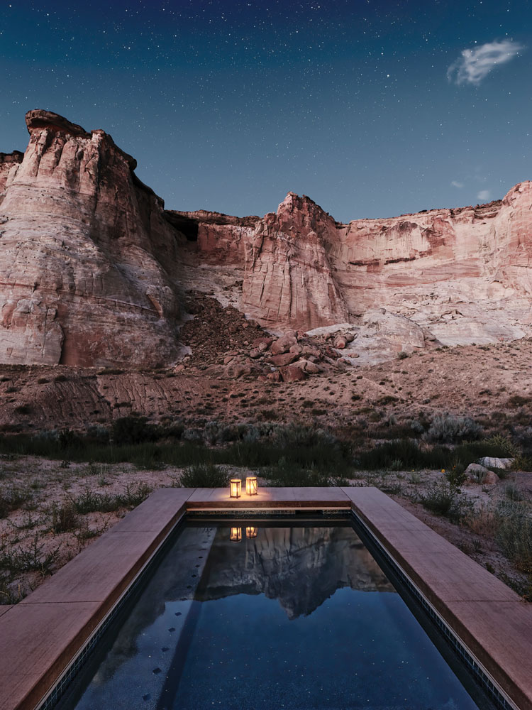 Camp Sarika’s central pavilion was designed by New York-based Selldorf Architects, and the building seamlessly anchors to the environment. Paying homage to its sister property, Amangiri—a 30-minute hike or five-minute drive from the encampment—the main building’s minimalist design of simple concrete blocks blends effortlessly into the rock. At the entrance, an art installation by acclaimed Asian American artist Maya Lin titled “Wahweap” welcomes guests with a glass-and-marble piece inspired by the course of the Colorado River as it flows from nearby Lake Powell to Lake Mead, while open fireplaces and earthy materials further connect the building to its natural surroundings. Leading through to an expansive outdoor terrace, the swimming pool is flanked by shaded daybeds and a heated whirlpool spa. The restaurant offers both indoor and outdoor seating, surrounded by fire pits that add to the atmosphere.