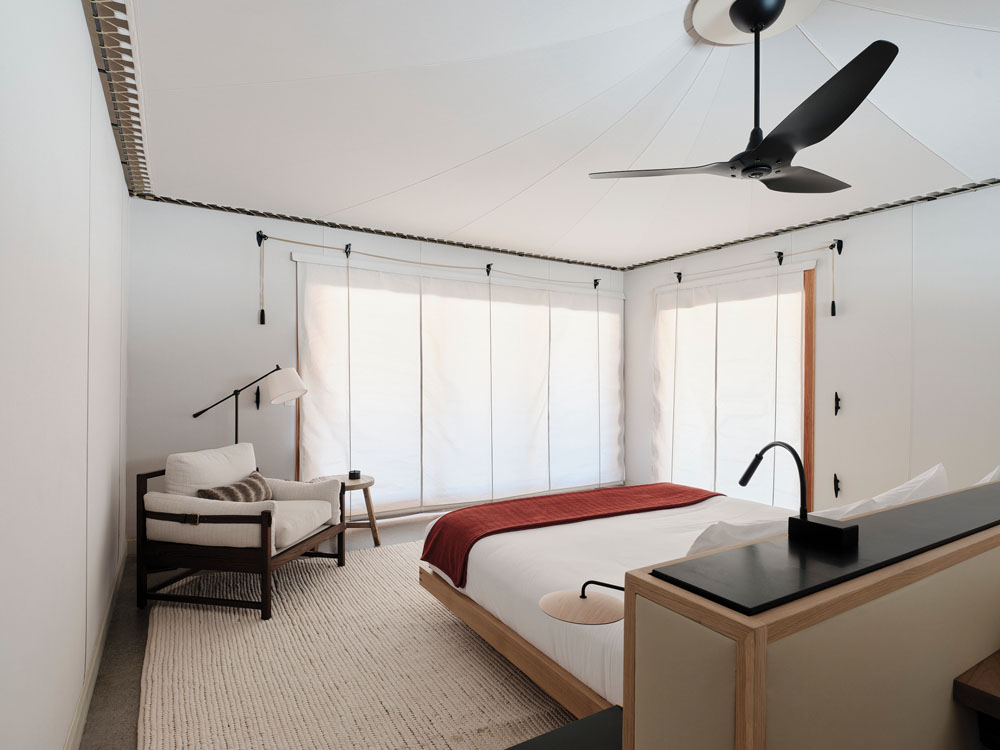 Evenly divided between one- and two-bedrooms, the 10 units are each equipped with a living area, dining area, wet and dry bar, as well as private bathrooms with a bathtub and indoor and outdoor showers. While the one-bedroom tents are approximately 1,900 square feet, two-bedroom tents offer over 2,800 square feet, both with an outer layer of recyclable canvas. Inside, camp-style custom walnut desks are outfitted with drawers, slung with leather side pouches for magazines and information packs, and completed with a bespoke campaign chair with a sophisticated leather finish. Etched timber headboards on king and twin beds reference the carved surrounding landscape and are finished with soft cushions suspended from leather straps.
