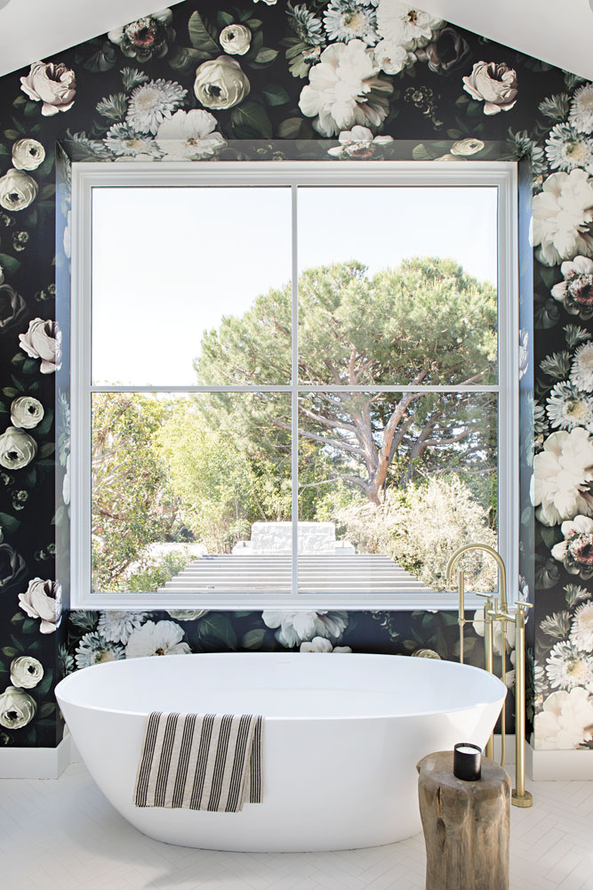 Newport Beach-based Raili Clasen ups the drama factor in the bathroom by setting a Victoria and Albert bathtub against a moody backdrop of Ellie Cashman’s floral wallpaper. The result? A still-life-worthy setting for a luxurious soak. (railicadesign.com) Photo: Karyn R. Millet