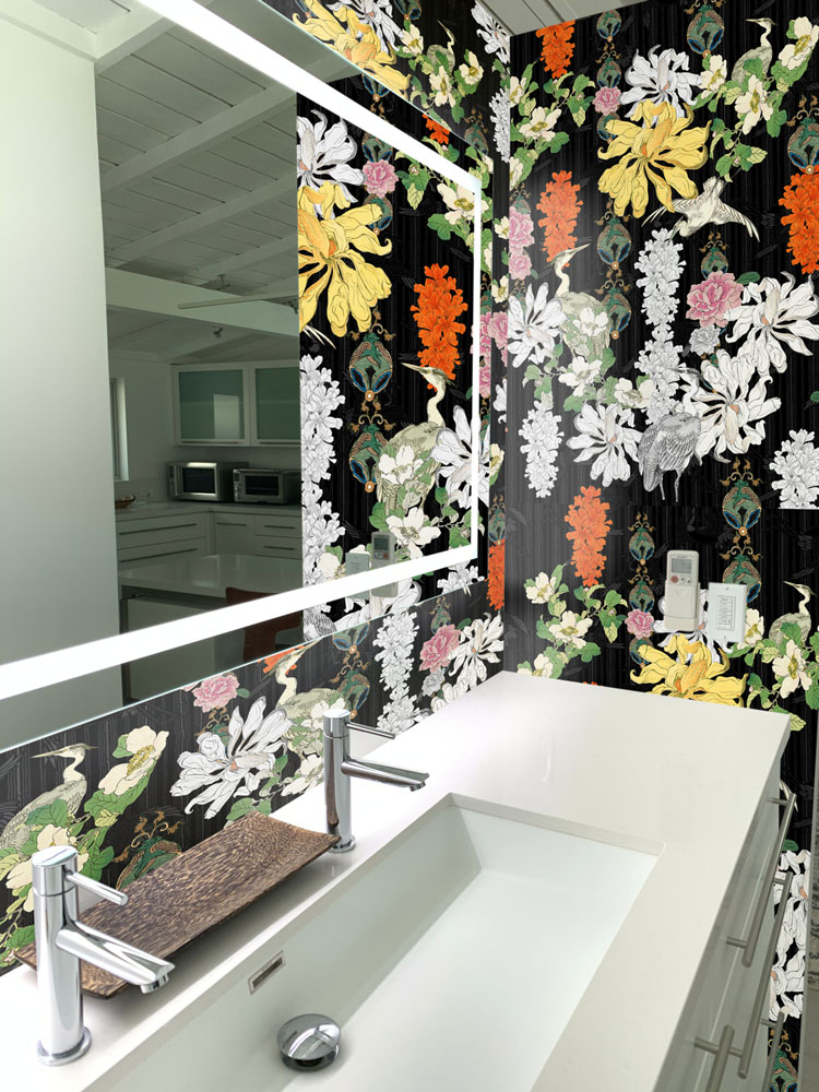 Laguna Beach artist, jeweler and designer Diana Garreau’s custom-made wallpapers bring bold pops of color to small or large bathrooms, such as this “An Egret” (bottom) and “Meadow Wallk” (top) designs that feel like a garden is blooming on your walls. (dianagarreau.com)