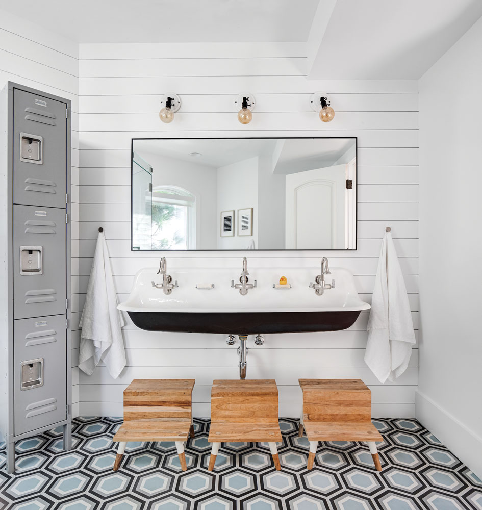 Laguna Beach-based Tania Cassill makes a modern case for a hard-working kids’ bathroom. Working in triplicate, Cassill mixes materials like shiplap walls, vintage-inspired lockers for storage and an old-school-style trough basin that looks entirely of the moment. Tiles from the Cement Tile Shop and stools from Serena & Lily complete the look. (huitlaguna.com)